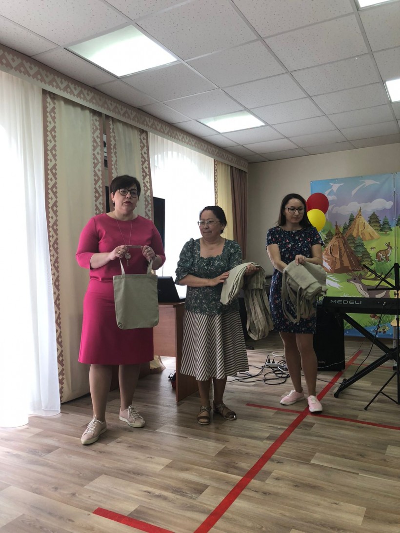 Галина Сергеевна Молданова продемонстрировала творческие работы выпускников этнокультурно-образовательного центра, исполненные в течение учебного года: игольницы, сумочки, бисерные украшения, различные обереги. Она планирует знакомить детей с орнаментами обских угров, из бисера будут плести разные фигурки. Галина Сергеевна подарила детям сумки шопперы, которые они украсят орнаментами.