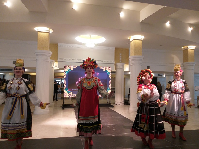Кстати, о костюмах. После церемонии открытия Форума была организована выставка-дефиле «Нарядная Россия», где свои народные костюмы продемонстрировали башкиры, буряты Забайкальского края, казачки Оренбургской области, манси, ханты, ненцы, якуты. Также зрители увидели старинный русский костюм некогда Псковской губернии, и коллекцию сценических костюмов, созданных на основе Белгородской, Орловской и Курской губернии России XVIII – XIX веков.