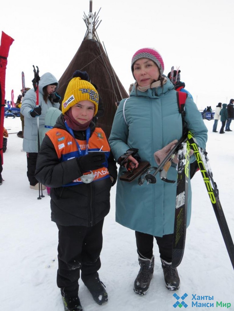 Юный житель Ханты-Мансийска Георгий Ткачук пробежал дистанцию в пять километров. Поддержать маленького спортсмена пришла его мама Наталья.
