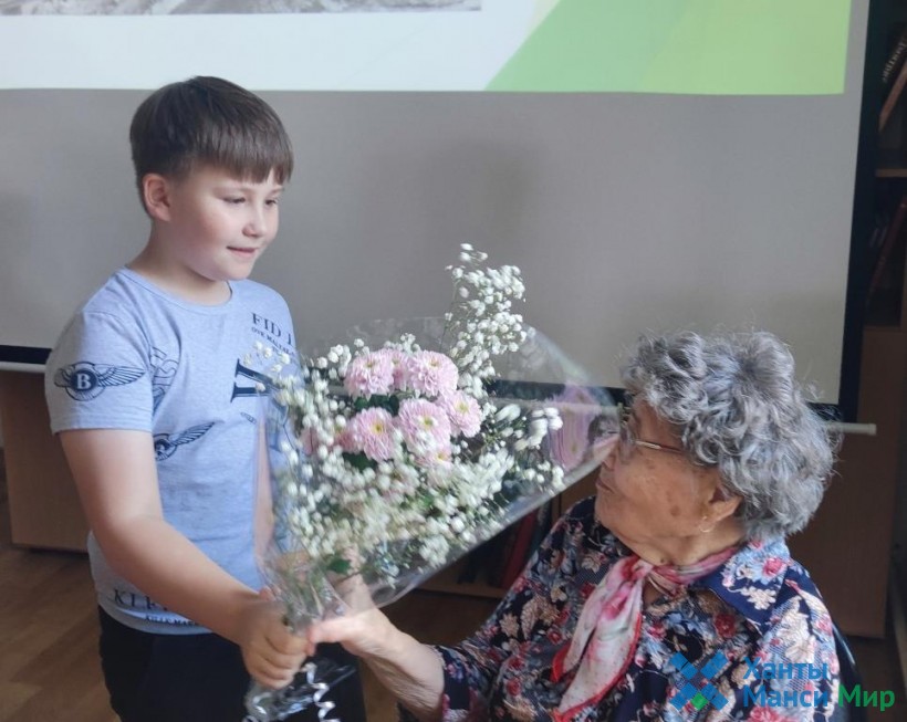 В подарок о тёплой встрече с Марией Константиновной ребята прочли стихи мегионских авторов, пожелали ветерану крепкого здоровья, долголетия и подарили букет цветов.